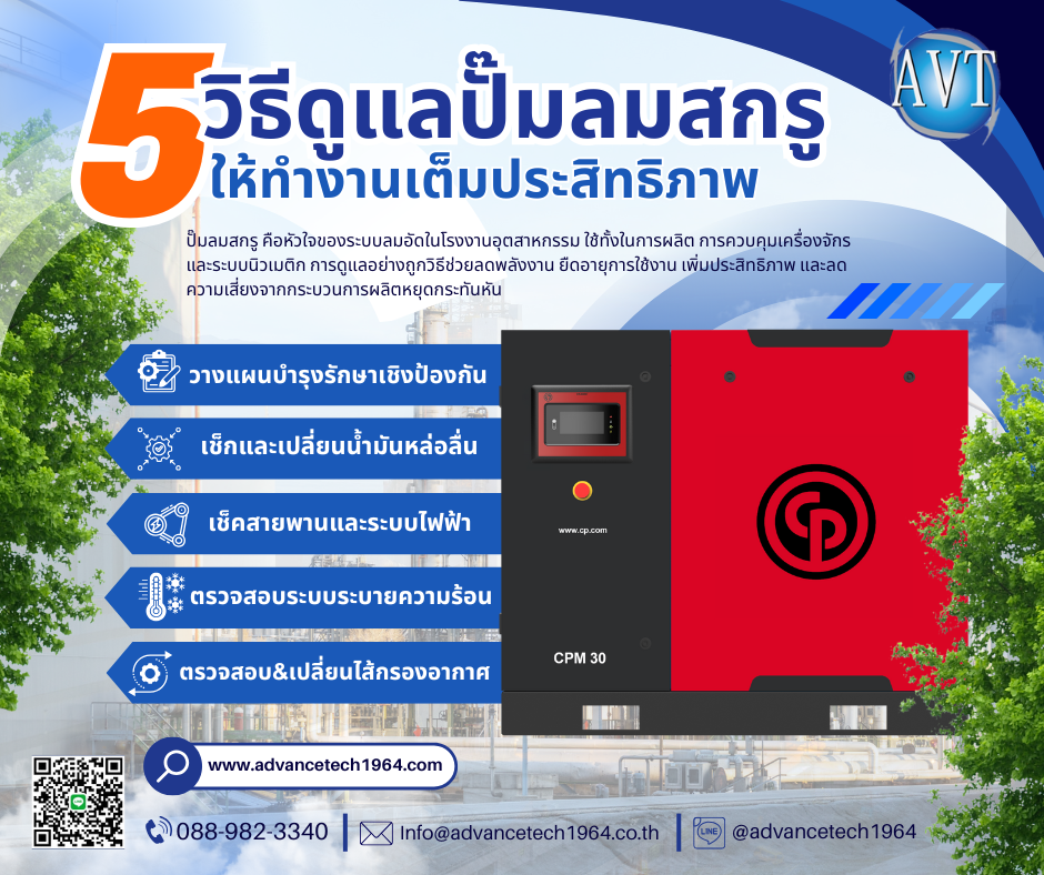 ในบทความนี้เราจะพาไปรู้จัก 5 วิธีดูแลปั๊มลมสกรูที่ควรทำเป็นประจำ พร้อมเทคนิคการบำรุงรักษาที่ช่วยให้โรงงานประหยัดพลังงานและต้นทุนซ่อมบำรุงในระยะยาวการให้ความสำคัญกับการดูแลบำรุงรักษาปั๊มลมสกรูอย่างสม่ำเสมอเป็นสิ่งสำคัญ เพราะช่วยยืดอายุการใช้งาน ลดค่าใช้จ่ายในการซ่อมบำรุง และทำให้เครื่องทำงานได้เต็มประสิทธิภาพ ตรงกันข้ามหากปั๊มลมสกรูไม่ได้รับการดูแลอย่างถูกต้อง อาจทำให้เครื่องทำงานหนัก กินไฟมากขึ้น และเสี่ยงต่อการเสียหายจนต้องหยุดกระบวนการผลิตได้