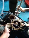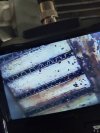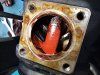 - Sticky brown/red deposits tightly adhering to metal surfaces in the lubrication system.
